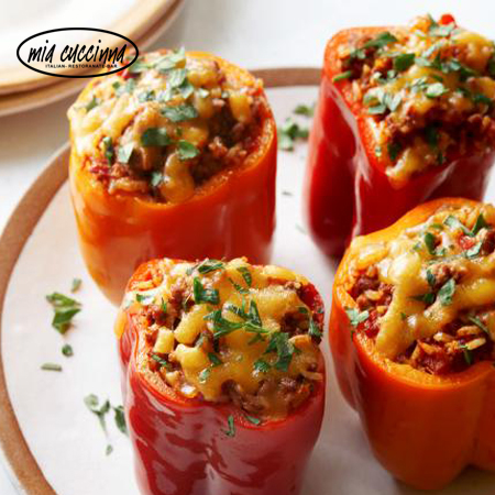 Bell pepper stuffed with vegetables & cheese sauce, spiced couscous